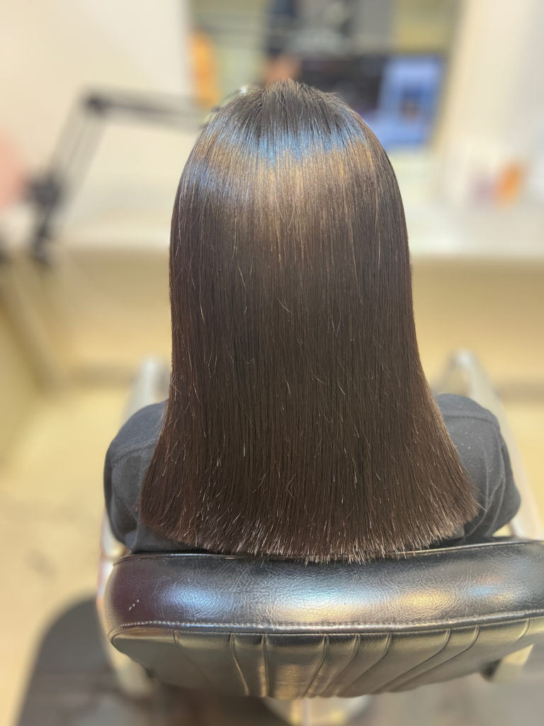 酸性縮毛矯正は、従来のアルカリ矯正よりも髪や頭皮への負担を軽減し、自然なストレートに仕上げられるのが特徴です。成長期のお子さまにも安心しておすすめできる施術です。
